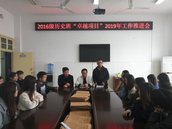 2016级历史学卓越班全体同学于3月18日上午十点在文综楼yl8cc永利官网会议室召开了新学期工作计划推进会,会议由卓越班班主任喻冰峰老师主持,yl8cc永利官网副院长陈红国、yl8cc永利官网历史学科专业负责人郭继红出席了会议。