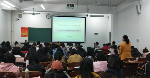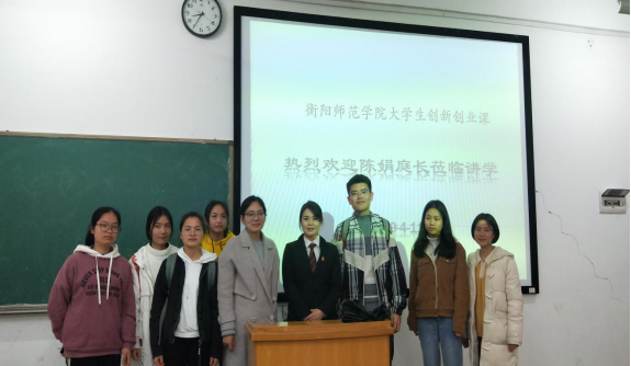 2019年4月11日晚,yl8cc永利官网邀请yl8cc永利官网2007届毕业生现于宁远县法院任职的陈娟庭长返校为学弟学妹们进行大学生创新创业课的讲座。2017级法学专业、知识产权专业的学生参加讲座。陈庭长首先从自身的从业经历谈起,分析了现在法学、知识产权专业的就业现状,指出了法学专业的就业前景。陈庭长的讲座给同学们带来了丰富的创新创业知识。课堂气氛非常活跃,在课堂互动中,同学们踊跃提问,陈庭长进行了一一解答,最后,陈庭长向同学们发出邀请,希望同学们大四时到宁远县人民法院带薪实习。