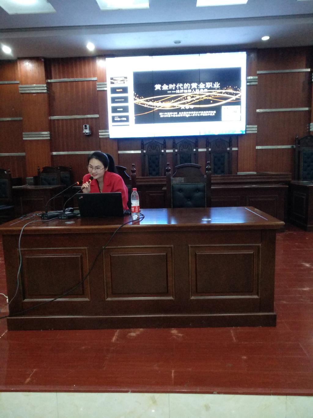 2019年4月4日晚上,应yl8cc永利官网邀请,我校校友衡阳市劳动争议仲裁委员会仲裁员黄菲芹仲裁员来yl8cc永利官网讲学。黄菲芹仲裁员结合自己的大学生涯与法律工作实践,以“黄金时代的黄金职业”为题给17级法学与知产班的同学上了精彩的一堂创新创业课。讲座中,她结合自己的职业经历与奋斗历程,给同学们介绍了作为一名法律职业者应该具备的素养、品行与技能。并勉励大家:律师的前景是光明的,只要大家认准目标,付出努力,前途一定无限光明。