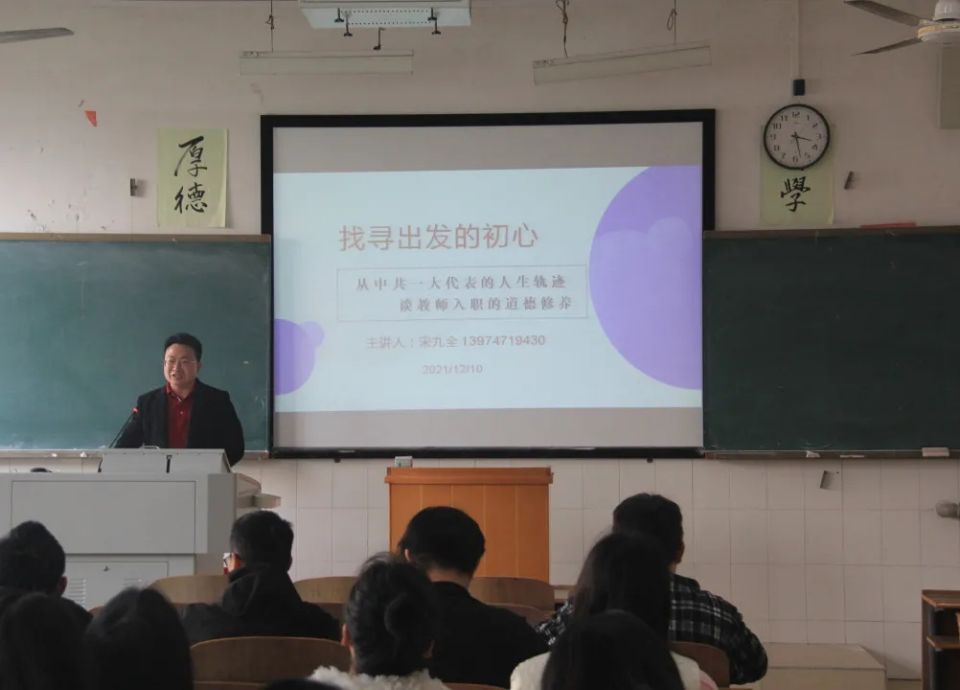 12月10日下午,衡阳市铁一中学特级教师宋九全莅临yl8cc永利官网,为2020级历史卓越教师班学生开展题为“找寻出发的初心——从一大代表的人生轨迹谈教师职业道德的修养”的红色文化专题讲座。