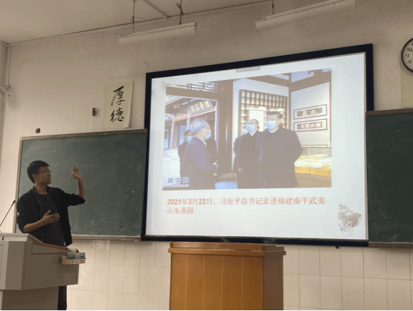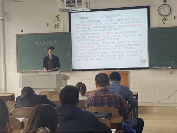 接下来是谢川岭博士的《宋代理学思想》,谢老师以习近平总书记走进福建南武夷山朱熹园考查后提出的“坚持把马克思主义基本原理用中国具体实际相结合,同中华优秀传统文化相结合”思想为切入点,讲述了宋代理学代表人物朱熹的生平和后世对朱熹的评价。宋社洪副教授评价谢老师这堂课基本功扎实,内容翔实,准备充分,但由于时间限制,整堂课的内容与标题没有保持一致,另外他建议谢老师将朱熹的生平及他的思想穿插讲解,二者有机结合起来。贺琤副教授则针对谢老师的教态提出一些建议。