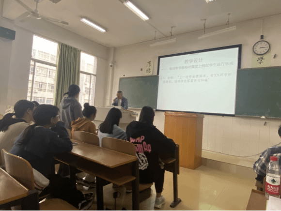 杨晓老师讲授了《中小学法制教育》中“教育惩戒中的禁止行为”这一章节,他首先模仿中学教师对课堂上违纪学生进行惩戒,包括罚抄、罚站、区别对待学生、跑10圈等行为,引导学生对这些行为进行分析,通过情景互动教学告诉学生如何通过教育惩戒向学生传递正确的成长观、德育观、法治观。曾志华副教授觉得杨老师教态自然,导入很有亮点,课堂互动好,但课件元素单一,建议杨老师增加其他元素,让课件更有感染力,罗文正教授在评课中也表示杨老师导入形式好,学生互动完整,且加入了课程思政元素,他同时也建议杨老师利用信息化手段进行课堂互动。