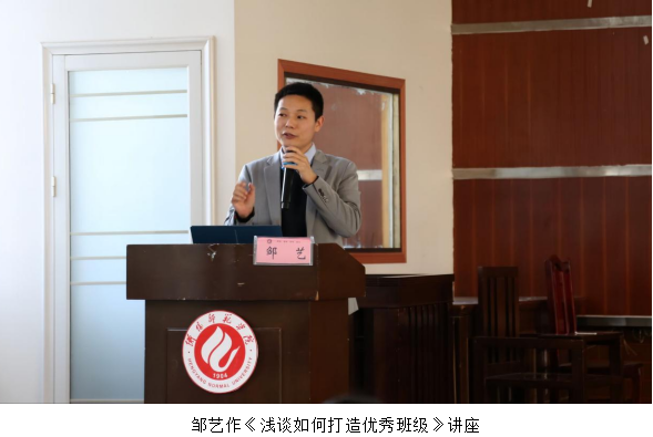 邹艺老师以“如何打造优秀班级”为讲座主题,从学风建设、纪律建设和卫生建设三方面阐述优秀班级的打造方法。讲座最后,他总结到,班级建设要围绕“爱”展开,需要做到爱岗位、爱学生,明白教育的目的,以树人为核心,以立德为根本。