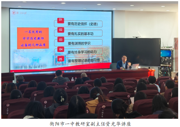 资光华以《精彩源于细节 细节成就品质:略谈师范生到历史教师的修炼之路》为讲座主题,认为一名优秀的中学历史教师要有历史情怀、要有扎实的基本功、要有渊博的学识、要有终身学习的动力、要有整理记录的好习惯,并结合自己的教育教学经历作了阐释和说明。