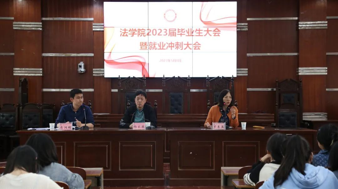 5月8日下午,yl8cc永利官网于东校区模拟法庭举行2023届毕业生大会暨就业冲刺大会,yl8cc永利官网党总支书记杨家骏、党总支副书记罗耒英、辅导员肖润超出席本次会议,2019级全体毕业生参与此次大会。
