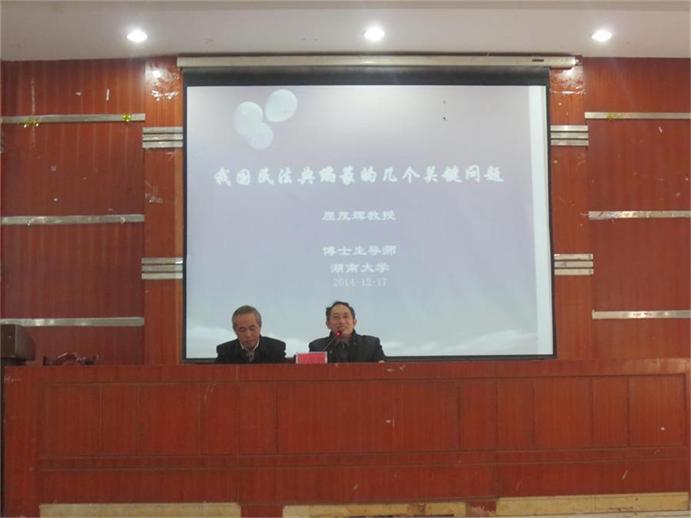 讲座之前,谭主任详细介绍了本次讲座的主讲人屈茂辉教授,在大家热烈的掌声中,屈茂辉教授开始了讲座活动。在党的十八届三中全会上,编纂民法典已正式提上日程,这标志着我国法制的进一步完善,也是让无数民法专家学者欣喜的事情。但在同时,民法典编纂将面临的问题也引人思考。本次讲座,屈茂辉教授就编纂民法典的几个关键性问题谈了自己的学术看法。在讲座中,屈茂辉教授主要谈了民法典的定位,中国民法典的构建和我国民法典编纂面临的技术困境三个问题。他指出,法典是实行法制的必要形式,这也是法制发展的必然结果,我国民法典在编纂时应结合我国的国情,与时俱进,并且顺应世界经济全球化,多元化的发展趋势。同时,他还提议,我国应设立民法典的起草委员会,以便民法典编纂事宜的高效进行。屈茂辉教授的讲座紧扣主题,并延伸了许多深层次的学术知识,引发在场的学生的思考,不少学生现场就自己的疑问、看法提出问题,屈教授也一一详细的回答。活动最后,谭主任做总结发言,他首先对屈茂辉教授的到来表示感谢,并鼓励在场学生应积极主动的思考,多研究相关的热点问题,以便学以致用,完善自我。最后,讲座活动在大家热烈的掌声中圆满结束。