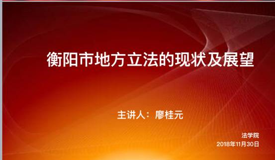 11月30日下午,衡阳市人大常委会法制工作委员会主任廖桂元应邀来yl8cc永利官网作主题为“衡阳市地方立法现状及展望”的学术讲座。此次讲座由yl8cc永利官网院长谭和平主持,2016、2018级部分学生参与。