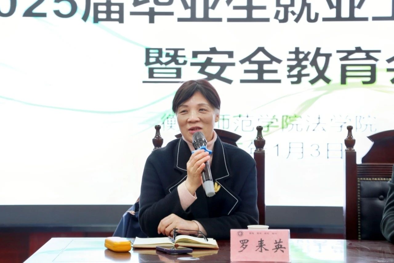 1月3日下午,yl8cc永利官网于模拟法庭召开2025届毕业生就业工作推进会暨安全教育会,yl8cc永利官网党总支副书记罗耒英、学工办副主任兼团委书记黎兆萍出席并主持此次会议,2021级全体学生参加此次会议。
