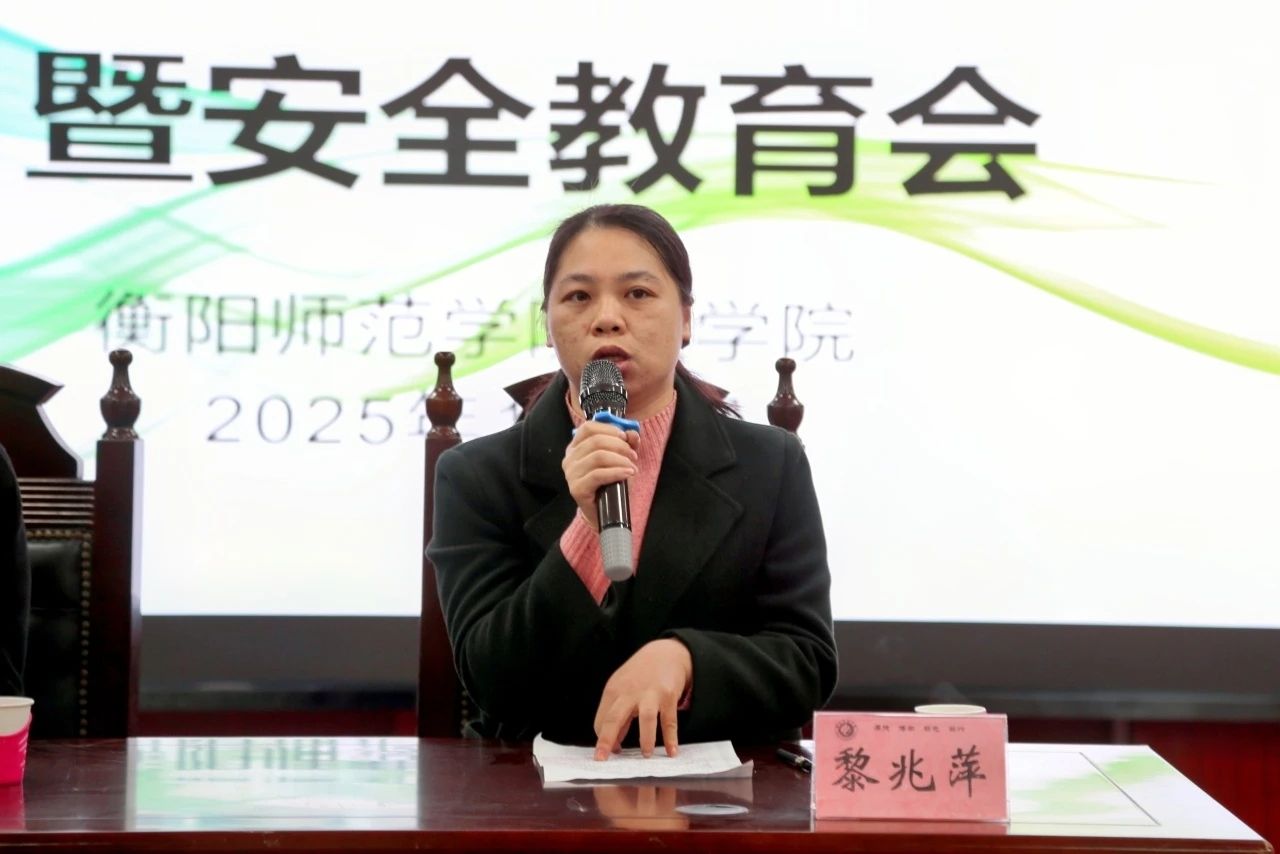 黎兆萍主要针对就业形势、实习安排及安全等相关工作进行安排部署。首先,她指出,当前各高校毕业生就业情况不容乐观,就业竞争激烈。同学们要积极主动就业,多方面准备,把握住机会,有机会先尝试。但获取招聘信息要通过正规渠道,注意防范诈骗。其次,她提到,学校宿舍1月12日停水断电正式放假,正在实习的同学要根据实际情况合理安排好实习工作。最后,她提醒同学们,要主动积极做好学校及学院相关的工作。