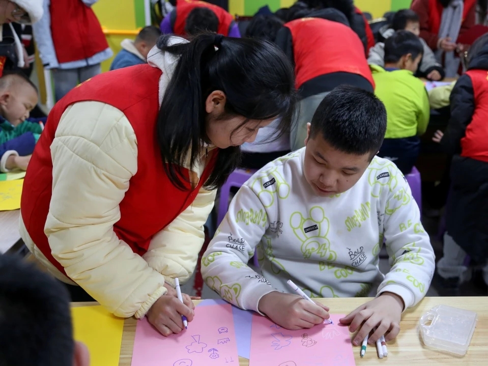 志愿者使用毛绒球、彩纸等材料指导孤独症儿童进行手环DIY,在制作时,志愿者鼓励孩子们充分发挥想象力,展示他们的独特创意,这一活动不仅能够提升他们的专注力和创造力,更能够促进其心理健康发展,增强社交互动能力。