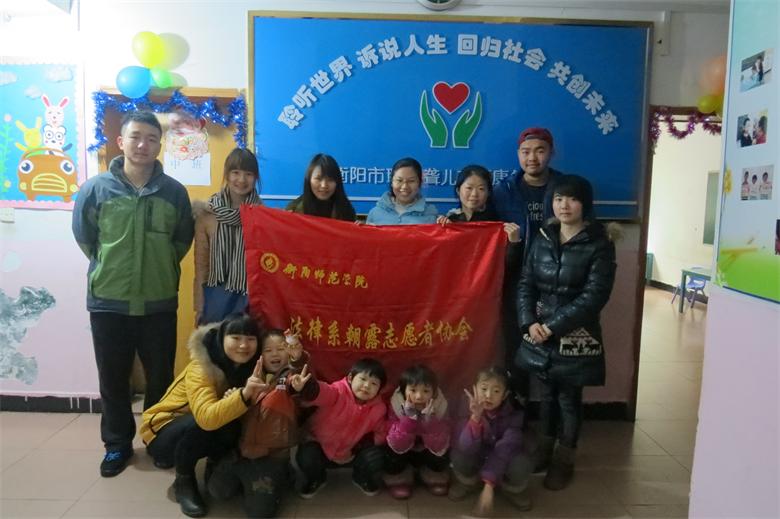 2014年12月27日上午八点,法律系团总支书记钟佩玲带领学生党员及朝露志愿者协会的成员们前往衡阳市聆音聋儿康复中心举行庆祝双“蛋”公益活动。此次活动旨在弘扬志愿者们的奉献精神,在元旦来临之际给康复中心的聋哑孩子们送上一些关爱,让他们感受社会的温暖。