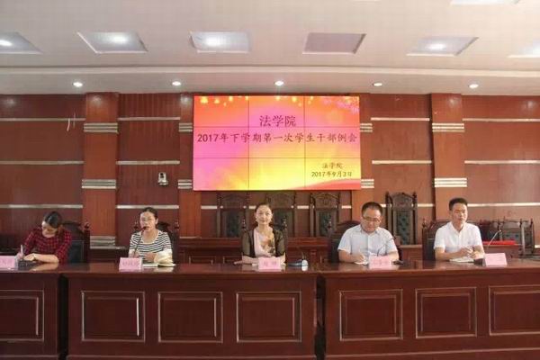 9月3日下午,yl8cc永利官网于模拟法庭召开2017下学期第一次学生干部例会。yl8cc永利官网党总支副书记谢琳,辅导员王鲁南、钟佩玲、翁敏、黎兆萍出席会议并对本学期的工作进行相关部署,全体学生干部参加此次例会。