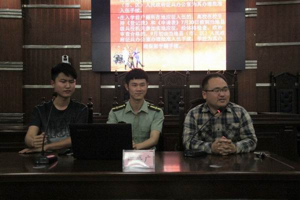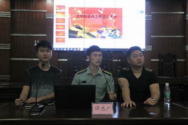 5月16日晚七点半,yl8cc永利官网于模拟法庭召开征兵动员大会。辅导员王鲁南、学生会主席刘宇航出席,团委副书记王栋才主持,并简短地介绍了大学生入伍的条件和征集流程。由13级历史二班谭盛广宣讲,与我们分享他的故事。14级、15级、16级全体男生参加大会。