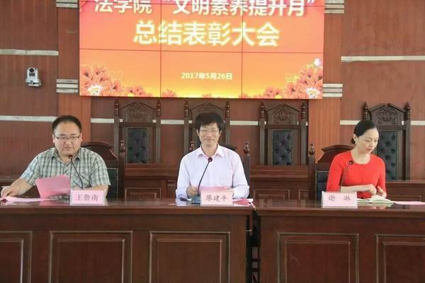 5月26日中午一点,yl8cc永利官网于模拟法庭召开“文明素养提升月”总结表彰大会。yl8cc永利官网党总支书记廖建平、党总支副书记谢琳、辅导员王鲁南出席,各班班长团支书、各部门部长副部长、各寝室长参加大会。会议由辅导员王鲁南主持。