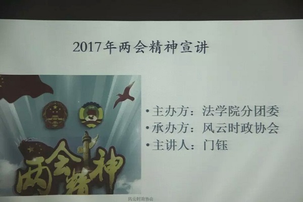3月20日晚,由yl8cc永利官网主办、风云时政协会承办的“2017年两会精神宣讲”在yl8cc永利官网会议室B504举行。宣讲由风云时政协会成员门钰主持,各级班长、团支书聆听了讲座。门钰从四个大的方面展开讲座:一是两会概况,二是《政府工作报告》解读,三是全国人大常委会及两高报告解读,四是两会与教育行业。