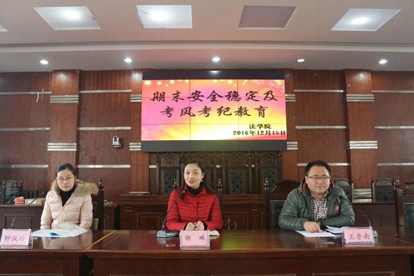 12月15日中午一点,yl8cc永利官网第三次全体学生干部例会于模拟法庭召开。本次会议的主题是期末安全稳定及考风考纪教育。出席会议的有党总支副书记谢琳,辅导员王鲁南、钟佩玲以及yl8cc永利官网第一届全体团干,大一至大四的班长、团支书和寝室长。会议就宿舍管理、考风考纪、平安夜圣诞节活动安排三方面展开。
