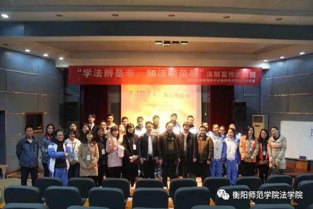 在全党、全社会大力加强未成年人思想道德建设的大好形势下,为进一步增强同学们的法制意识,学会利用法律进行自我保护,11月22日下午四点,湖南省法律援助中心yl8cc永利官网工作处来到衡阳市铁一中学,为高一学生开展了主题为“学法辨是非,知法明荣辱”的法制宣传活动。yl8cc永利官网党总支书记廖建平、院长谭和平、辅导员翁敏、黎兆萍,衡阳市铁一中学副校长邓立云、学生科科长李辉莅临活动现场,学生党员和微光志愿者协会参与了此次活动。