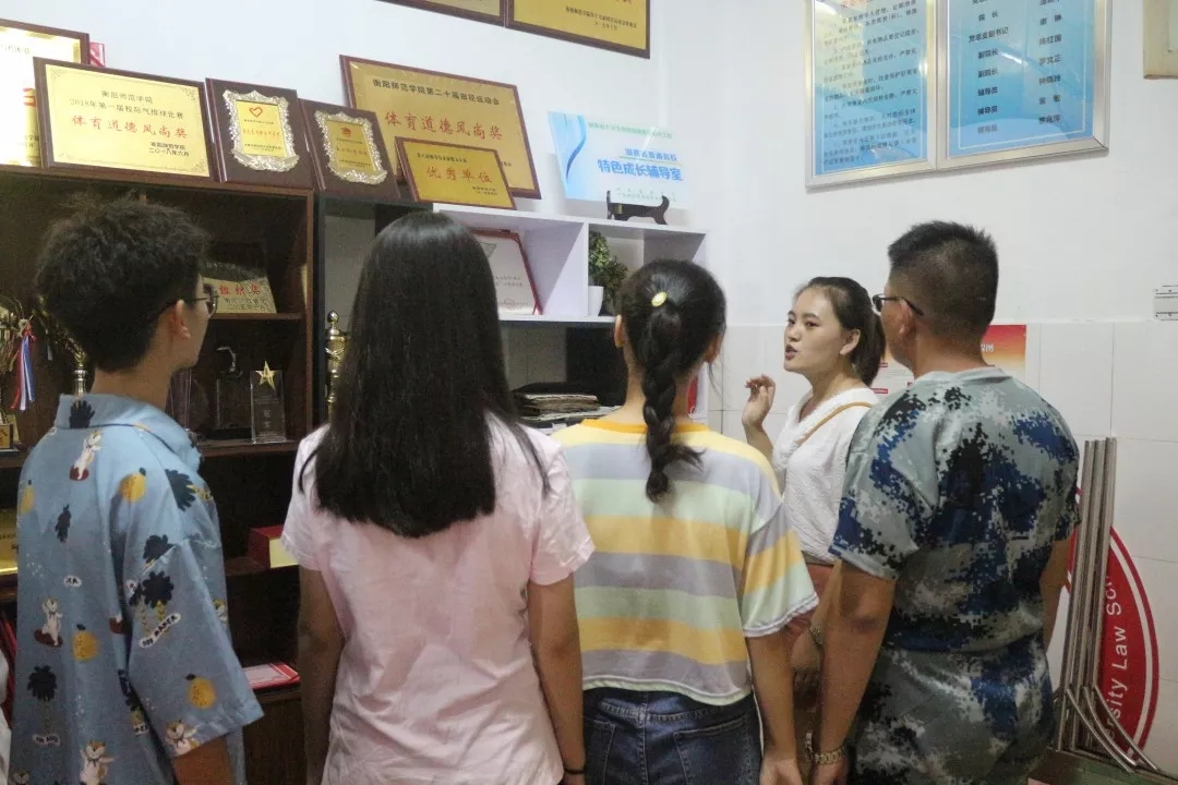 2018级知识产权1班宋钰洁担任本次活动的讲解员。她向新生代表介绍了yl8cc永利官网的发展历程、历年来取得的主要成绩,并详细介绍了yl8cc永利官网的特色活动:“法治三进”、文明素养提升工程、习近平新时代中国特色社会主义思想诵唱会、速录技能大赛等。同学们驻足在荣誉室里,跟随讲解员仔细地观看着一张张奖状、一块块荣誉牌、一面面锦旗。