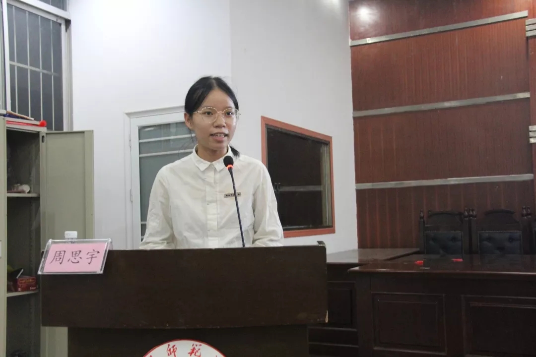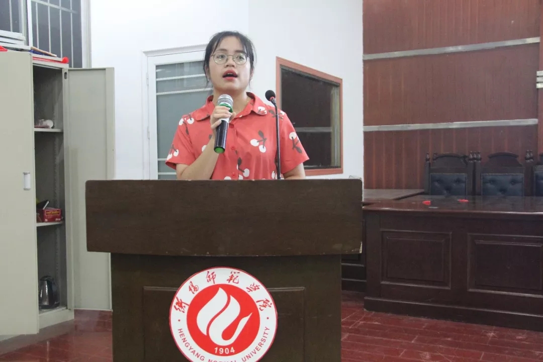 周思宇以“南学津梁,百年衡师”为主题,向同学们叙述了学校成立的背景及历史沿革,并结合新民主主义革命时期的历史,绘声绘色地叙述了我校历届校长曾熙、段延珪、颜方珪和蒋啸青等人的生平事迹及其为我校做出的突出贡献。她还讲到,我校曾涌现了如黄克城、黄静源等许多可歌可泣的优秀校友,他们自强不息、无私奉献的精神品质都值得我们每一个衡师学子去学习。