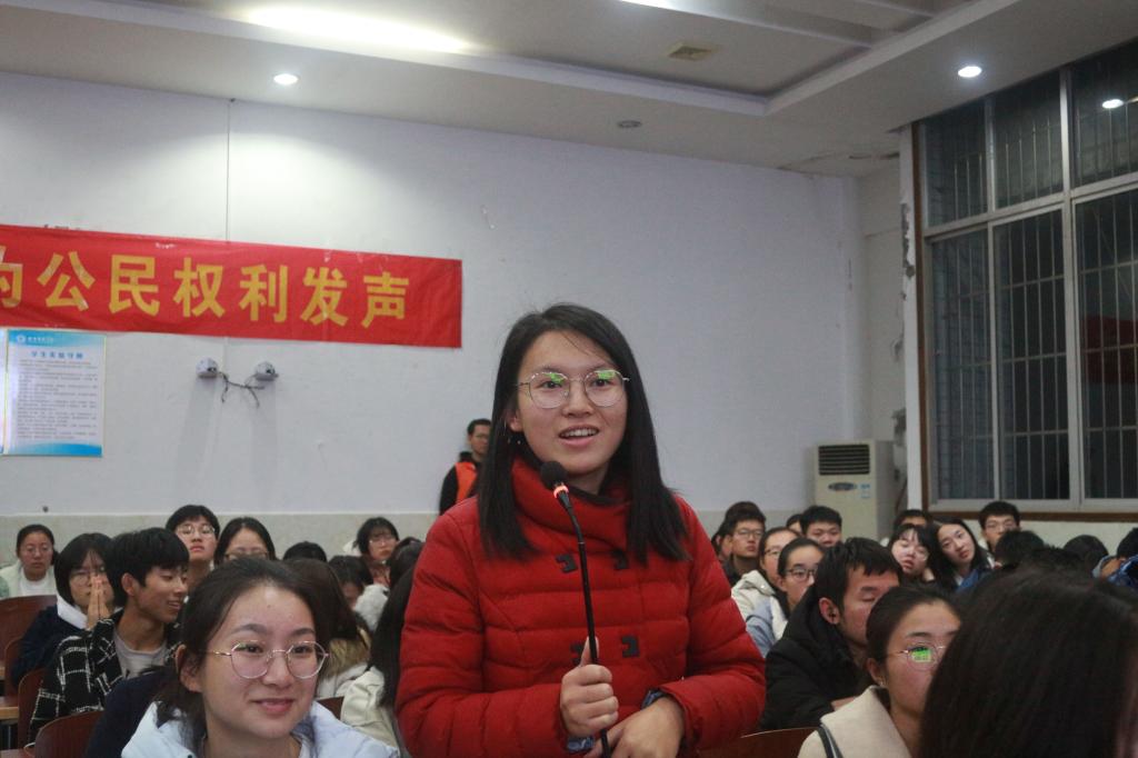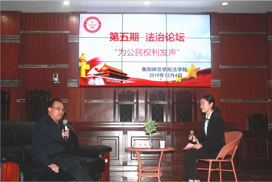 12月4日晚,yl8cc永利官网在模拟法庭开展第五期法治论坛。此次活动以“为公民权利发声”为主题,我院党总支书记刘余香、院长谭和平、党总支副书记谢琳出席活动,法学专业教师胡峻教授担任访谈嘉宾,200余名学生代表参与论坛。