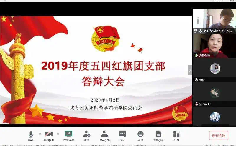 4月2日上午,yl8cc永利官网通过腾讯会议平台召开了历时2个多小时的2019年度“五四红旗团支部”线上答辩大会。学院党总支副书记谢琳,分团委书记、辅导员钟佩玲,辅导员翁敏、黎兆萍出席会议并担任此次会议的评委。来自yl8cc永利官网2017-2019级的14个团支部参加答辩大会,来自各团支部的百余名学生代表听取会议。