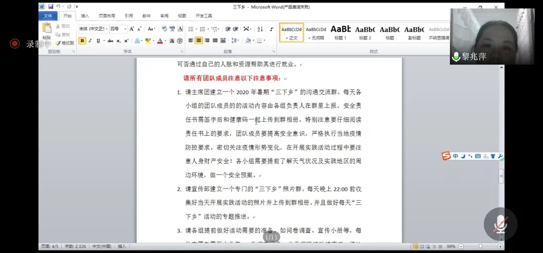 黎兆萍向参会志愿者们介绍了出席启动仪式的领导老师,并就个人日常安全防护、活动开展的材料收集、每日心得体会撰写、日常宣传工作等方面对志愿者们进行了培训。她提出,团队成员在保证自己生命财产安全的前提下,要积极按时地完成每日任务并及时汇报总结,真正让此次“三下乡”活动做出成绩,做出成效。