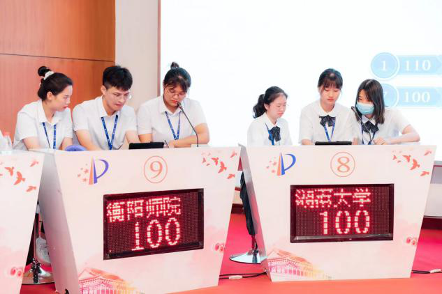 此次比赛分为五个环节。在第一环节必答题环节中,我校代表队和中南大学暂时并列第一。在第二环节的抢答环节和第三环节你问我答中,继续保持优势。在第四环节风险题环节中,题目共分为三档,即20分值题目、30分值题目、40分值题目,我校代表队勇于挑战,选择了40分的风险题并成功答对,但最终仅以15分的分差惜败中南大学。