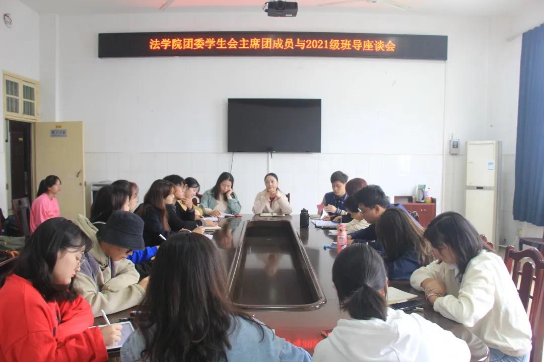 10月13日上午,yl8cc永利官网于文综楼B栋504会议室召开了团委学生会主席团成员与2021级班导座谈会。党总支副书记谢琳、辅导员黎兆萍、肖润超、彭婷婷出席会议,主席团成员与2021级各班导参加会议。