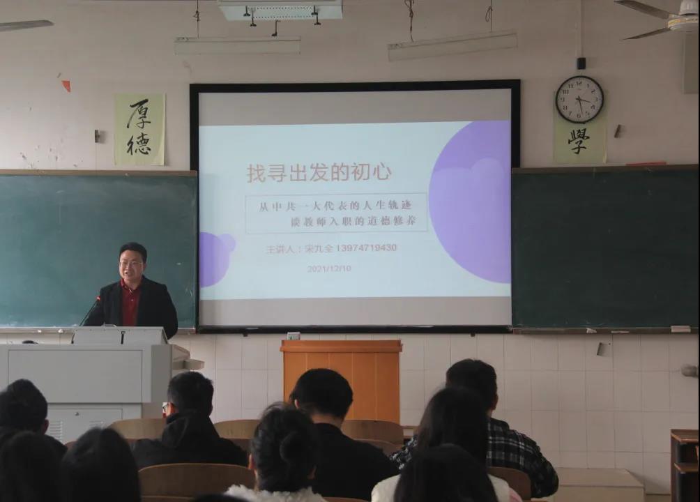 最后,宋九全特别强调,作为一名师范生,应积极汲取一大代表的优秀精神品质,树立良好的师德师风。他指出老师的境就是纯情的校园,纯洁的学生和纯粹的事业,教师的快乐在认清自己的境地,只要内心湛然,无往而不乐,快乐在心里,不假外求。