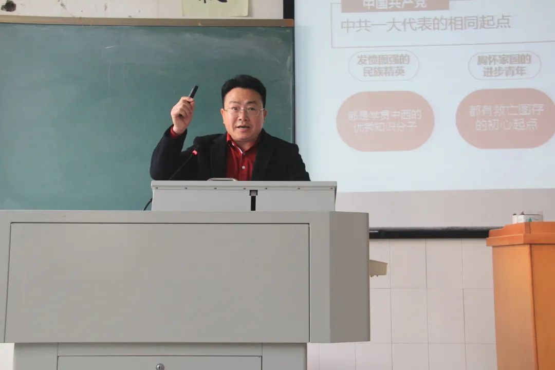 宋九全通过解读“不忘初心”的内涵引入本次讲座的主题,他以中共一大代表的人生轨迹为线索,从“中国共产党横空出世”、“中共一大代表的人生轨迹”、“一大代表人生轨迹的启迪”三大方面展开论述。他为同学们播放中共一大相关视频,并将13名一大代表的人生选择和人生终点归纳为不忘初心、奋斗一生,坚守初心、英勇献身,离党但坚守信仰,初心动、迷途知返,叛党祸国殃民五类,让同学们更加生动形象的了解13名一大代表。宋九全将13名一大代表的不同终点与自身经历及所见所闻相结合,给予同学们五点启示:一、坚定理想信念是安身立命的根本;二、树立平和心态使生活更圆满;三、不畏艰难困苦是事业成功的保障;四、建立和谐人际关系有助于缔造幸福人生;五、追求卓越永无止境。