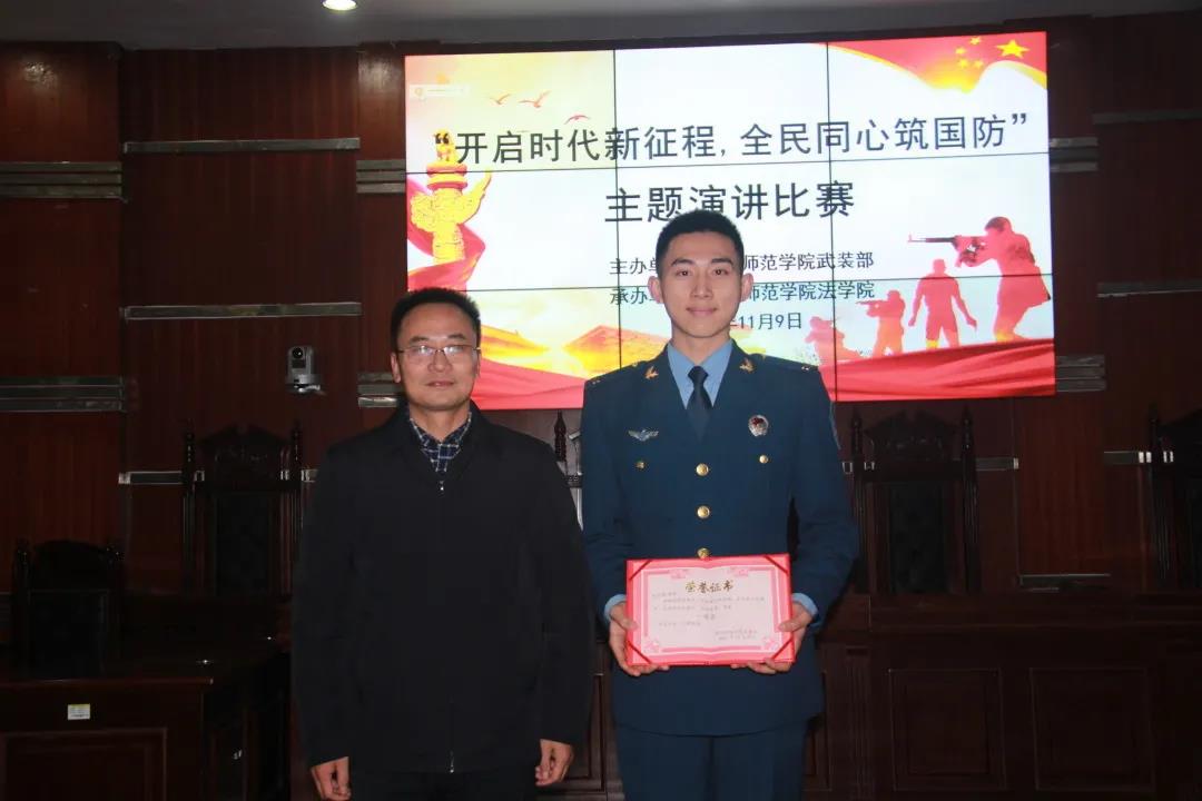 11月9日晚,由yl8cc永利官网承办的yl8cc永利官网“爱我国防”主题演讲比赛决赛于东校区模拟法庭举行。衡阳市雁峰区人武部军事科科长张家军、政工科科长邹辉、校宣传统战部常务副部长蒋杰、校党政办公室主任张波勇、文学院党总支书记张云峰担任评委,校武装部部长董俊、校武装部副部长周华、国防教育科科长彭伟家、yl8cc永利官网党总支书记卜华白、党总支副书记谢琳以及各教学院的征兵专干老师出席了本次比赛。共17名选手经过层层选拔进入了决赛。
