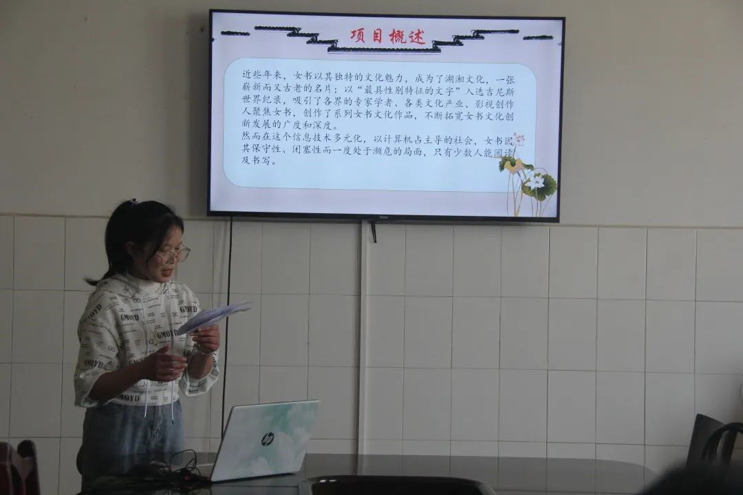 十号汇报人——2020级历史学四班的陈小菊在《非物质女书文化遗产的日趋衰败下“女书APP”的力挽狂澜》的项目汇报中,关注女性文字知识方面的问题,聚焦女书文化,借女书标签,发扬乡村地区女书特色文化,弘扬中华传统文化。