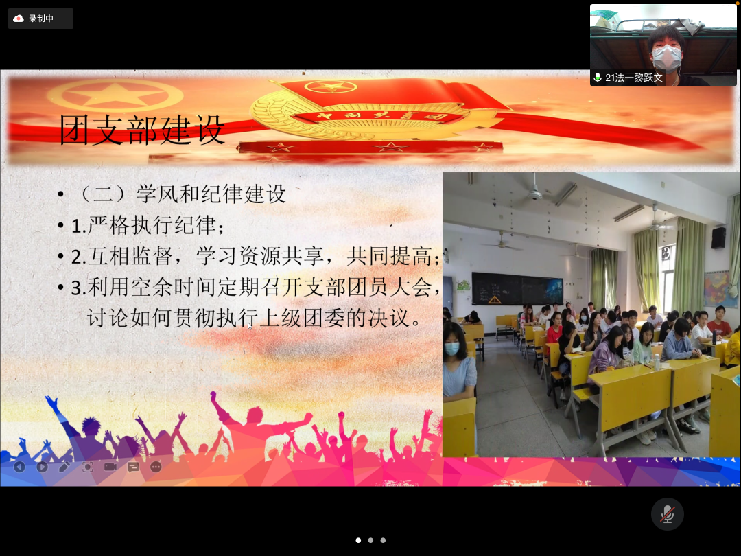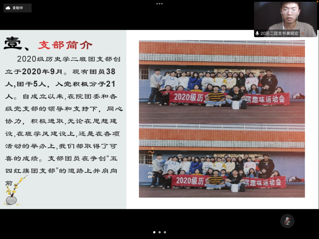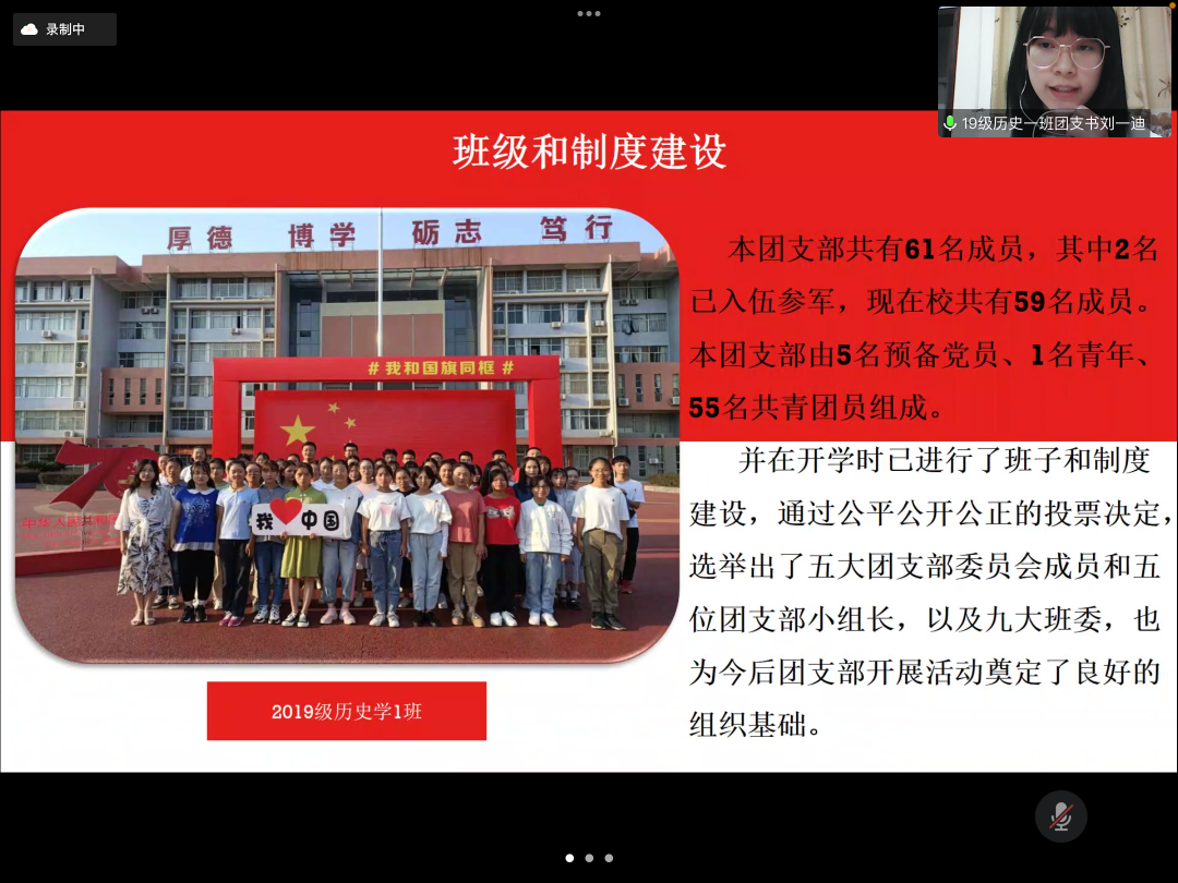 在他们的班级建设中有三个特色:第一,思想建设与自身历史专业特点相结合。第二,开展线上线下的团日活动。第三,回归学生本职,以加强自身建设为重点。在这三个特色之下,促使他们建设成了一个优秀的团支部。