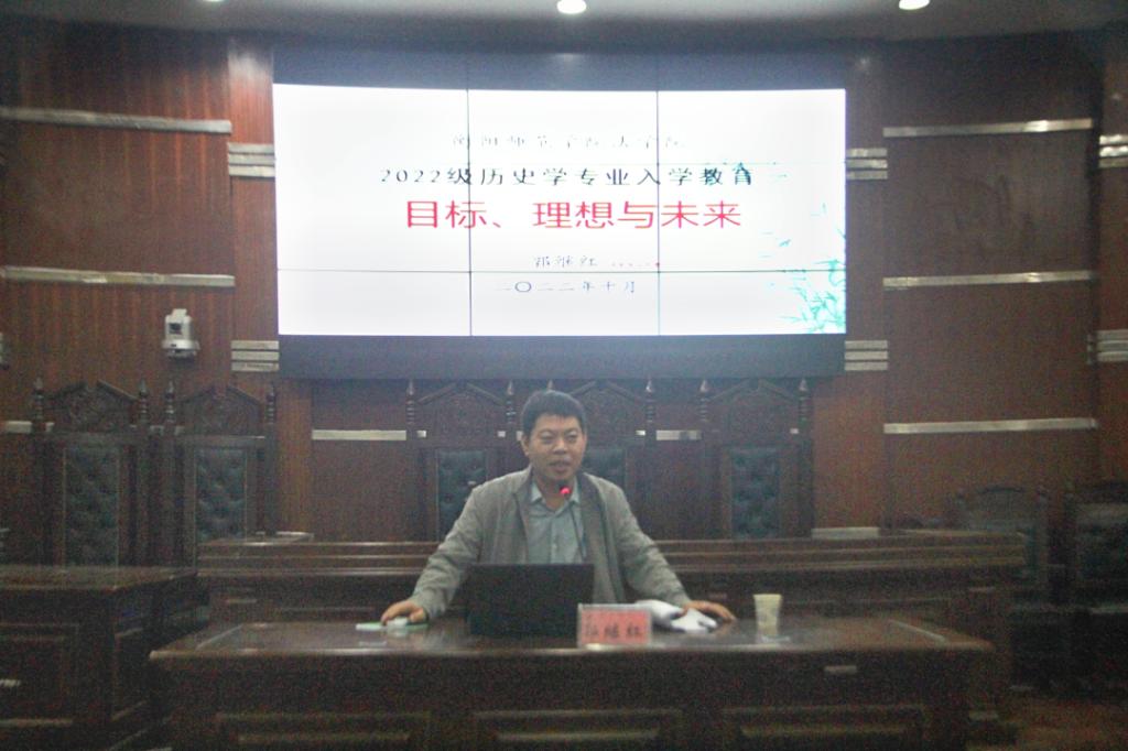 为进一步落实立德树人根本任务,切实增强大学生的责任感和归属感。10月12日晚,yl8cc永利官网于模拟法庭开展2022级新生历史学专业思想教育讲座。此次讲座由历史学专业负责人郭继红老师担任主讲嘉宾。