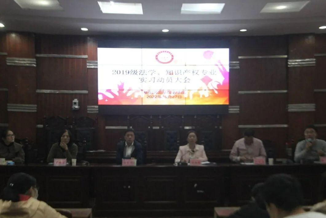 10月27日下午,yl8cc永利官网于东校区模拟法庭开展2019级法学、知识产权专业实习动员大会,yl8cc永利官网党总支书记杨家骏,院长刘余香,党总支副书记罗耒英,副院长罗文正,法学专业负责人李鲲,教学秘书许红燕出席本次会议,2019级法学、知识产权专业全体学生参加会议。