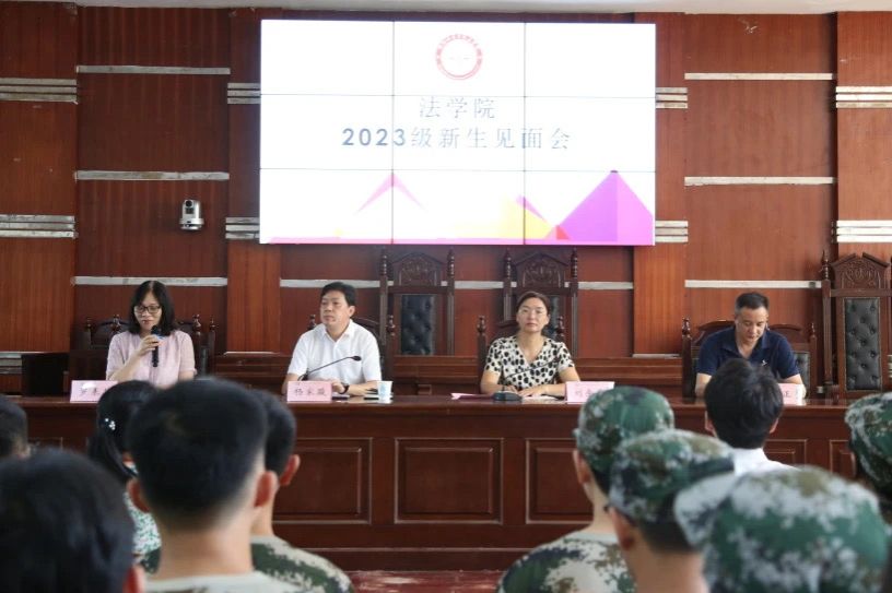 9月8日,yl8cc永利官网于模拟法庭召开2023级新生见面会暨军训动员大会。yl8cc永利官网党总支书记杨家骏、院长刘余香、党总支副书记罗耒英、副院长罗文正、学工办主任兼团委书记黎兆萍和辅导员肖润超、蒋秋琼、黄梓芸,2023级各班班主任及第十一届团委学生会主席团成员出席了本次会议,2023级全体新生及各班班导参加了此次会议。