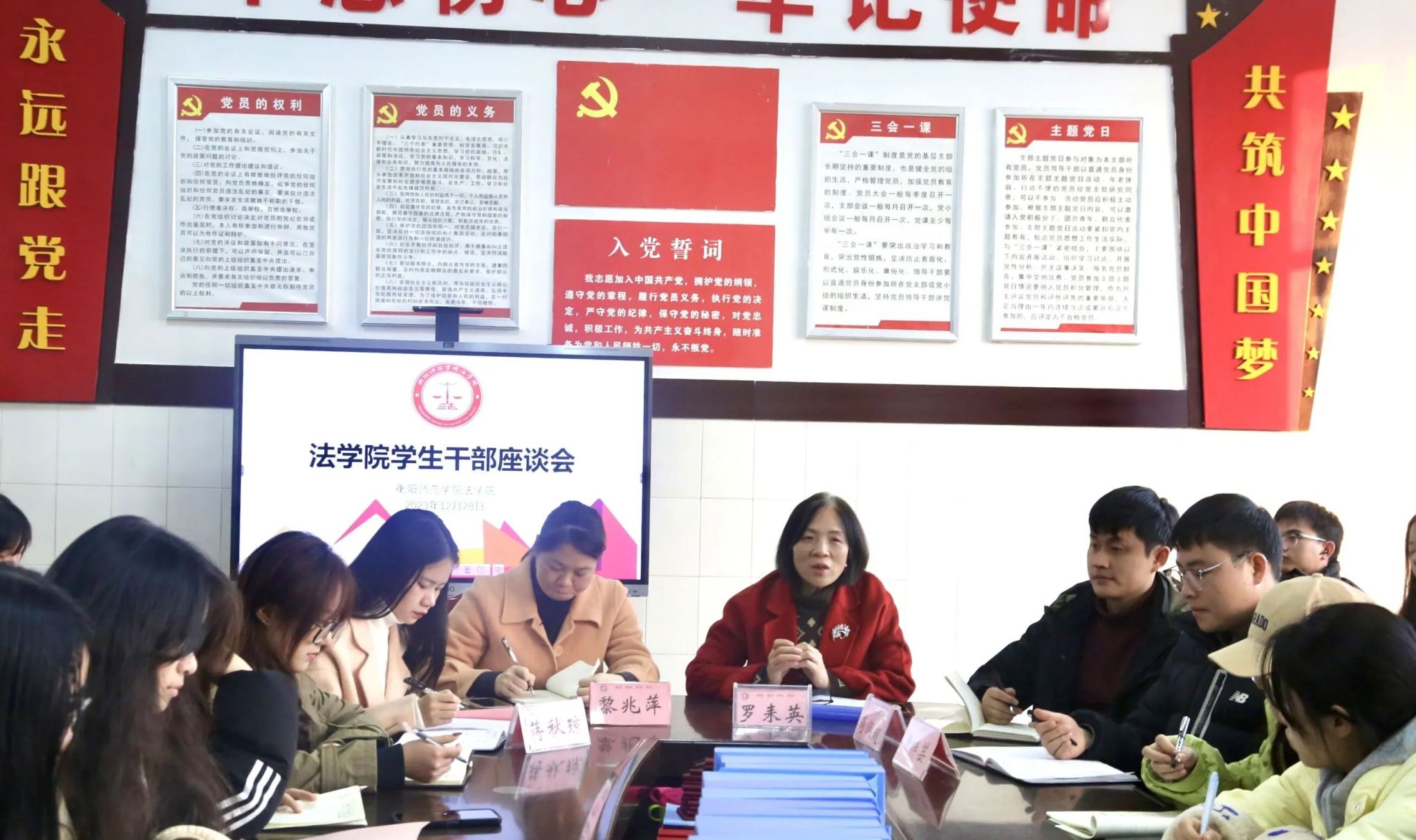 12月28日下午,yl8cc永利官网于文科楼B407会议室召开期末班团工作会议暨班团座谈会议。yl8cc永利官网党总支副书记罗耒英、学工办主任兼团委书记黎兆萍以及辅导员肖润超、蒋秋琼、黄梓芸出席会议,21-23级全体班团共同参加。
