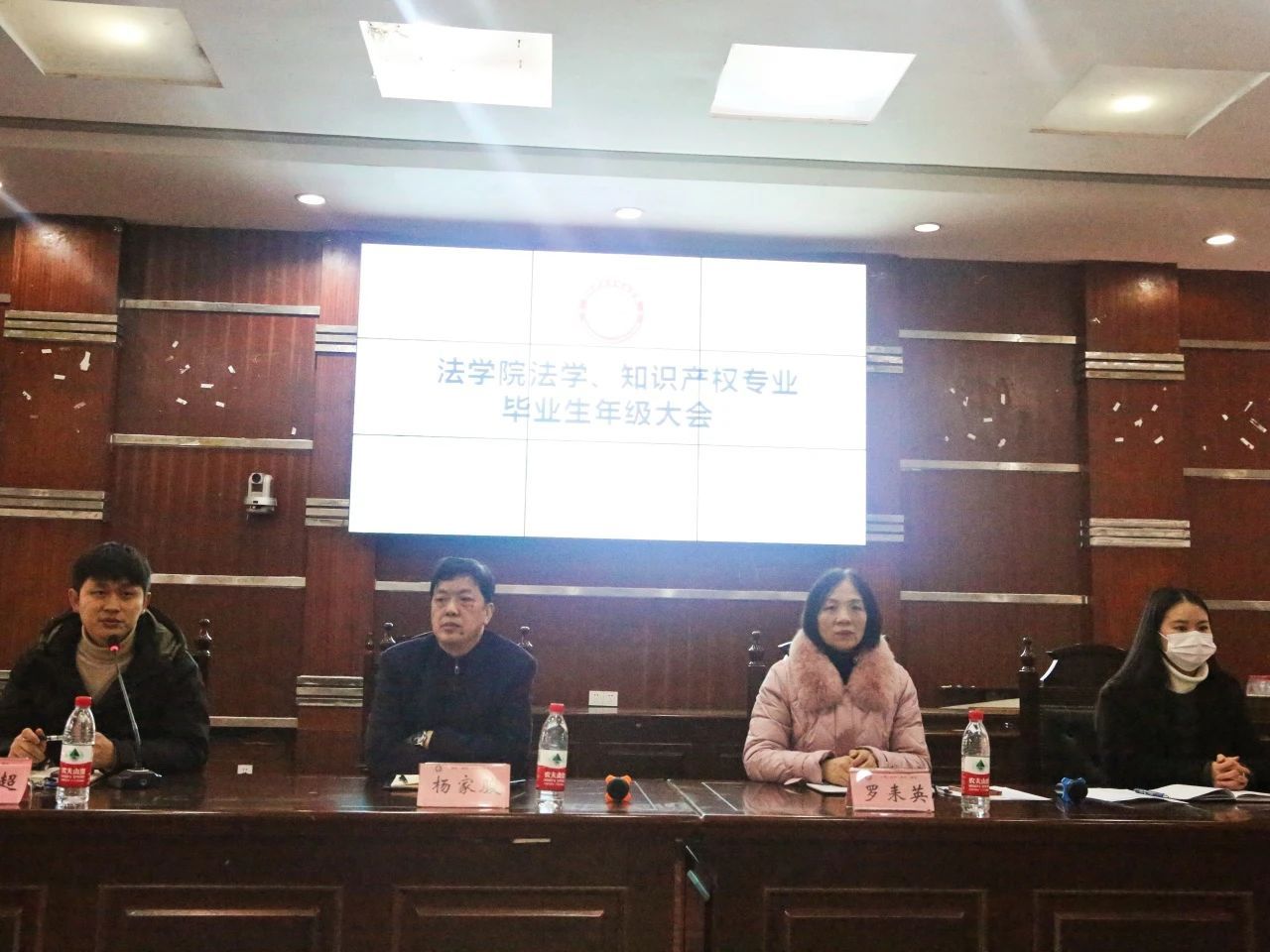 1月5日下午,yl8cc永利官网于东校区模拟法庭举行法学、知识产权专业毕业生年级大会。yl8cc永利官网党总支书记杨家骏,党总支副书记罗耒英,辅导员肖润超、蒋秋琼出席本次会议,2024届法学、知识产权专业毕业生参加会议。