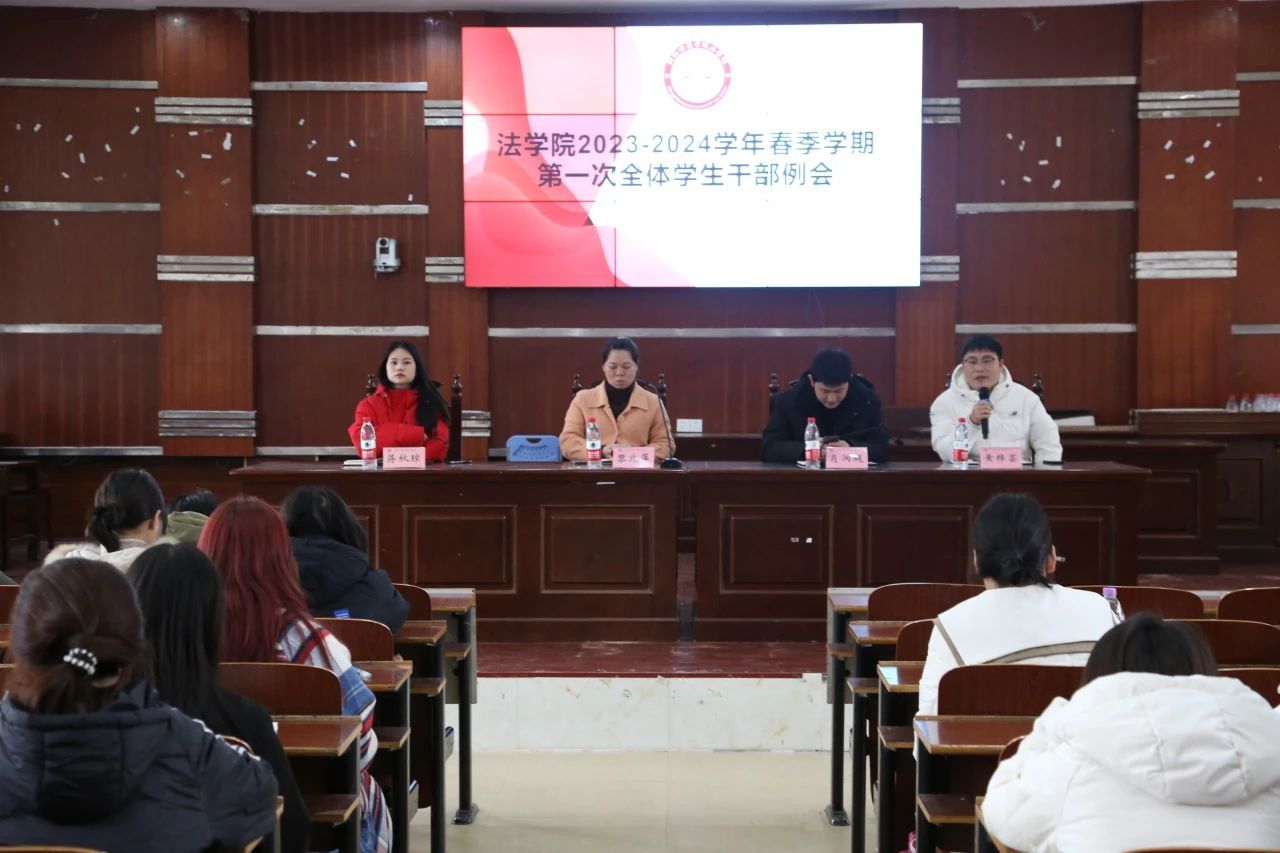 3月6日下午,yl8cc永利官网于模拟法庭开展2023—2024学年春季学期第一次干部例会。学工办副主任黎兆萍以及辅导员肖润超、蒋秋琼、黄梓芸出席会议,21-23级全体学生干部参加本次会议。