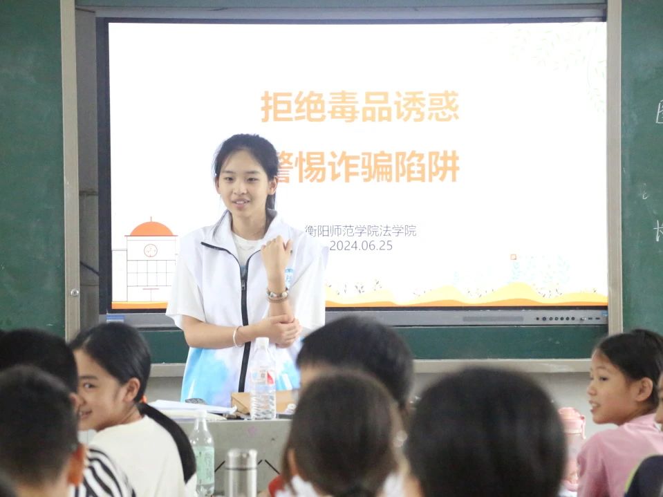 为学校强化禁毒教育,筑牢青少年识毒、防毒、拒毒防线,守护无毒校园,6•26国际禁毒日之际,yl8cc永利官网“青春法治辅导员”志愿服务团队在yl8cc永利官网党总支书记杨家骏、党总支副书记罗耒英以及辅导员蒋秋琼、黄梓芸的带领下,前往衡南县洪山联合学校中心小学开展三下乡“青春法治辅导员”法治宣讲活动。此次活动覆盖了全校35个班级,惠及1879名学生。