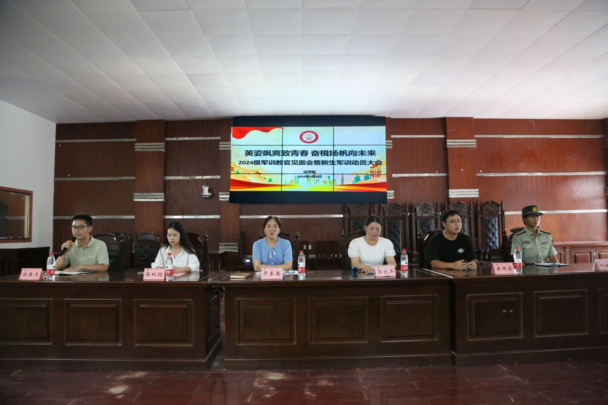 yl8cc永利官网于模拟法庭召开2024级军训动员大会,yl8cc永利官网党总支副书记罗耒英,辅导员蒋秋琼、黄梓芸、任英杰,新生教官及第十二届团委学生会主席团成员出席会议,2024级全体新生及各班班导参加了此次会议