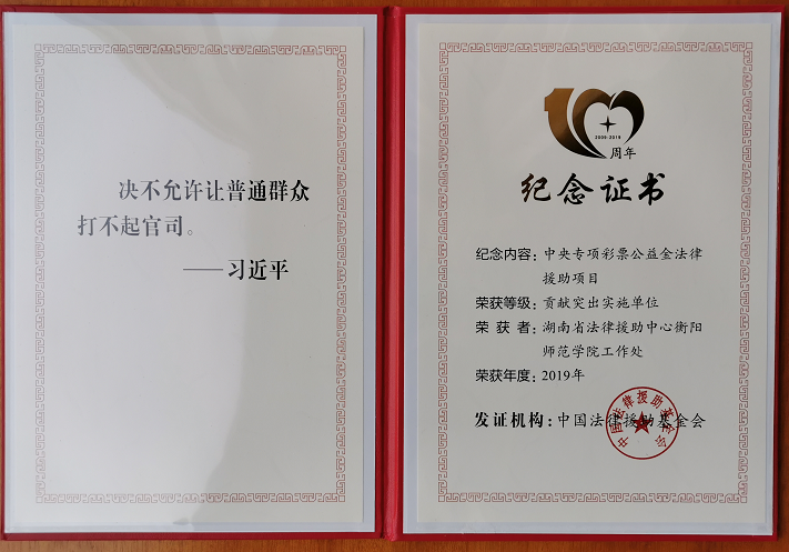 座谈会回顾了“1+1”、“中彩金”项目十周年的历程,一批全国法律援助先进单位及个人代表作了交流发言。大会还向法律援助突出贡献单位颁发了奖牌和纪念证书,向法律援助贡献杰出人员颁发了纪念章。我校法律援助工作处被授予“中央专项彩票公益金法律援助项目贡献突出实施单位”称号,受到中国法律援助基金会的表彰。我校法律援助工作处于2016年11月与中国法律援助基金会签订合作协议,成为“中彩金”法律援助项目执行单位,按照协议要求,为农民工、老年人、残疾人、妇女及未成年人等五类社会弱势群体提供免费法律帮助。3年来,在项目负责人陈红国的带领下,工作处全体法律援助律师带领和指导学生志愿者共受理法律援助申请130余件,已办结法律援助案件97件,为受援人挽回或减少经济损失300余万元,在打造实践教学平台,培养学生法律实务能力的同时,也为维护社会弱势群体的正当合法权益,防范和化解稳定风险,促进地方社会经济的发展贡献了自己的力量。