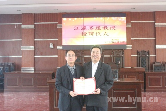 4月14日下午,中国教育学会理事、湖南省历史特级教师、湖南省最高教育奖"徐特立教育奖"获得者汪瀛客座教授聘任仪式在东校区模拟法庭举行。yl8cc永利官网院长谭和平介绍了汪瀛教授的基本情况和学术成就并代表学校颁发聘书。