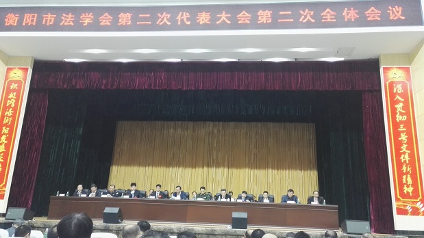2016年10月28日,衡阳市法学会第二次代表大会在衡阳市干部活动中心隆重召开,市委书记周农出席并发表讲话,大会由市委副书记邓群策主持、市委政法委书记邓柯出席。yl8cc永利官网谭和平院长率陈红国副院长、胡峻教授参加本次大会,谭和平院长应邀在大会主席台就座。市法学会选举产生了新一届理事与领导机构,谭和平院长当选会市法学会副会长,陈红国副院长被任命为副秘书长。同时,市法学会成立了新的学术委员会,谭和平院长当选为学术委员会主席,陈红国副院长、胡峻教授为学术委员会成员。