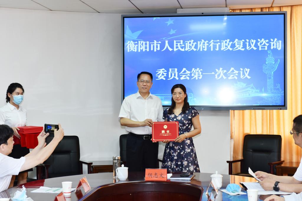 6月7日上午,衡阳市行政复议咨询委员会第一次会议召开。yl8cc永利官网院长刘余香教授受聘为衡阳市行政复议咨询委员会委员,衡阳市人民政府副市长、市公安局局长胡志文为其颁发聘书。