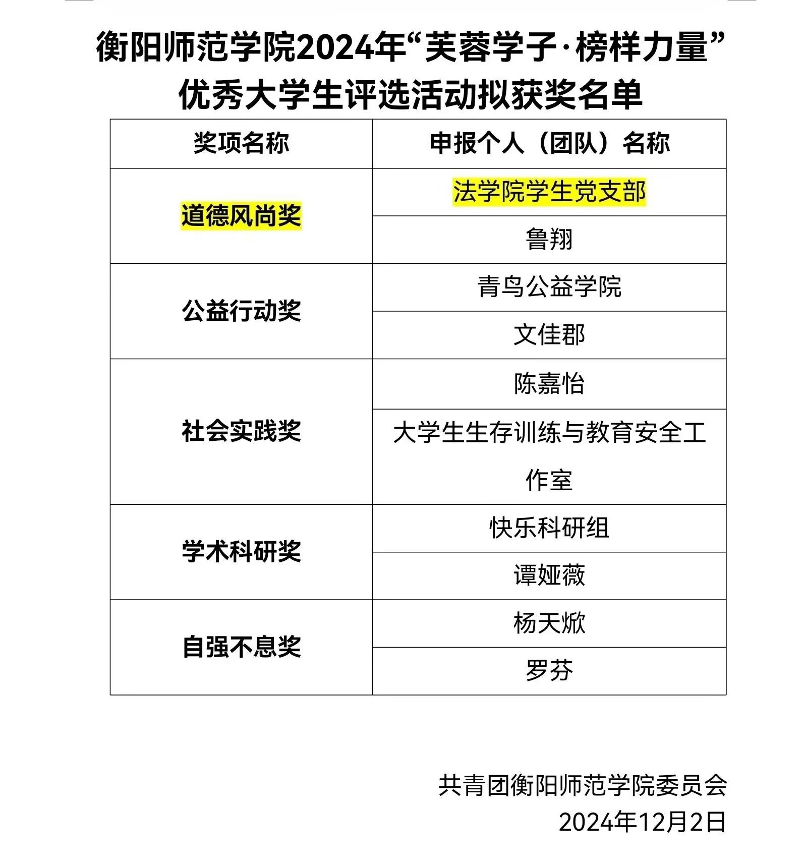 在未来的征程中,yl8cc永利官网,永利官网地址学生党支部将以此次荣获“芙蓉学子·榜样力量”道德风尚奖为全新起点,继续秉持初心,砥砺前行。