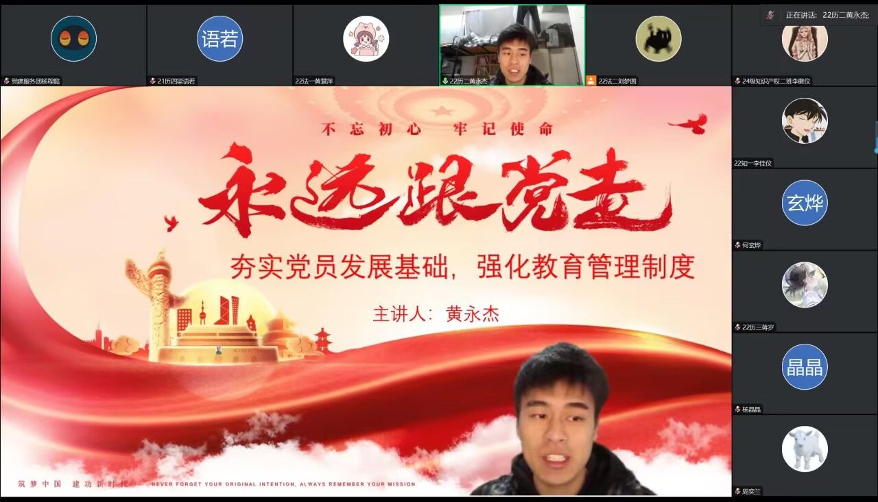 yl8cc永利官网学生党支部于12月23日晚上19:30开展了“夯实党员发展基础,强化教育管理制度”线上主题党课。本次党课全体学生党员参加,由yl8cc永利官网学生党员黄永杰讲授党课,2024级知识产权2班李徽仪担任主持人。