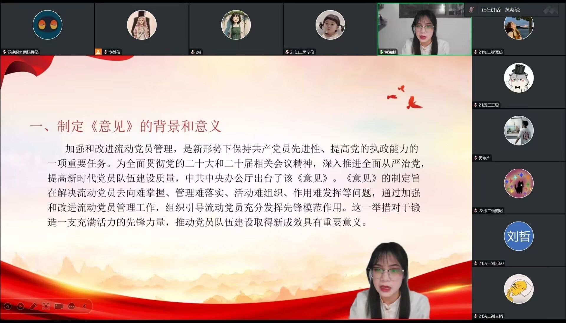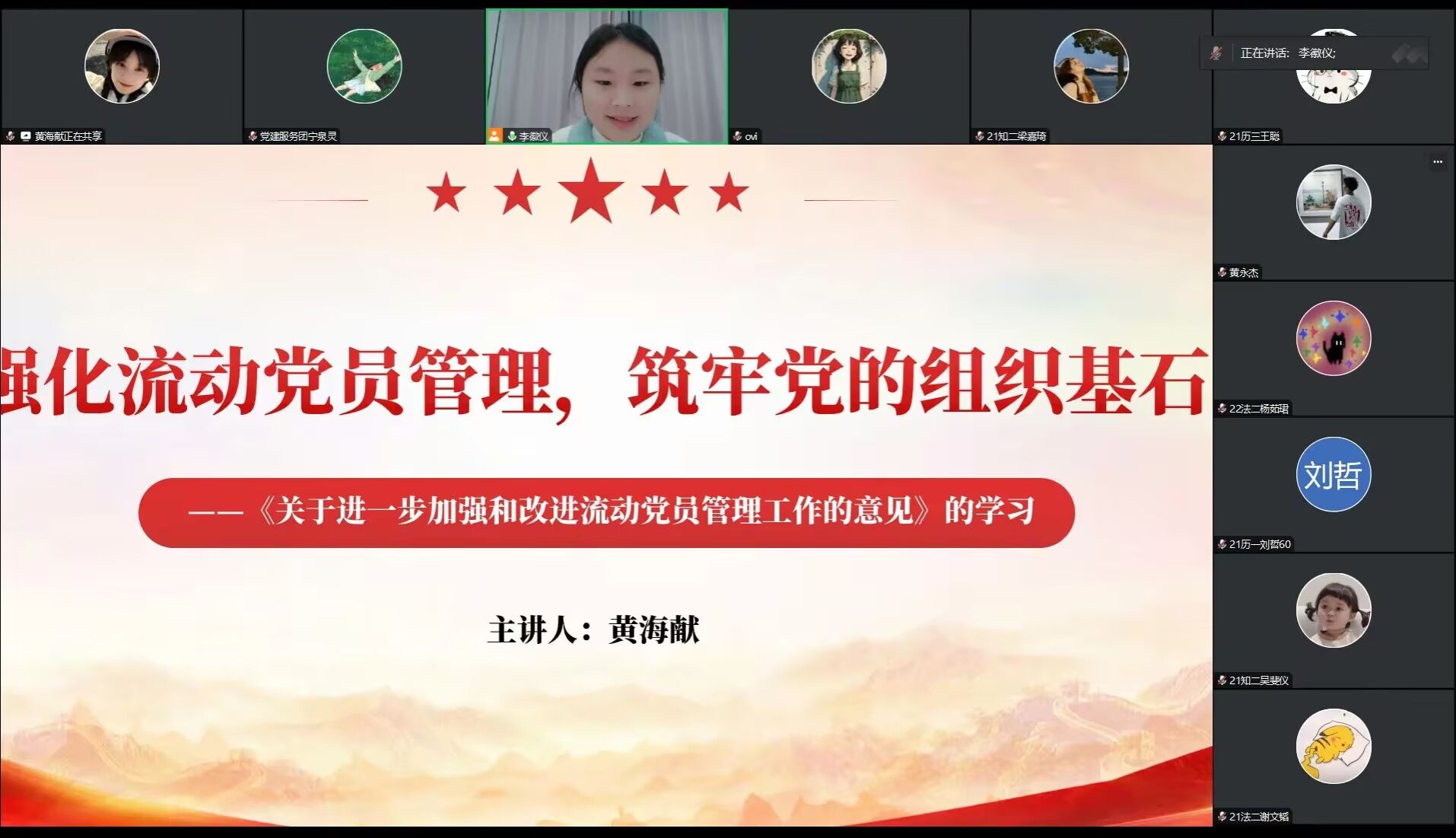 yl8cc永利官网学生党支部于1月22日晚上19:30开展了“强化流动党员管理,筑牢党的组织基石”线上主题党课。本次党课全体学生党员参加,由yl8cc永利官网学生党员黄海献讲授党课,2024级知识产权2班李徽仪担任主持人。