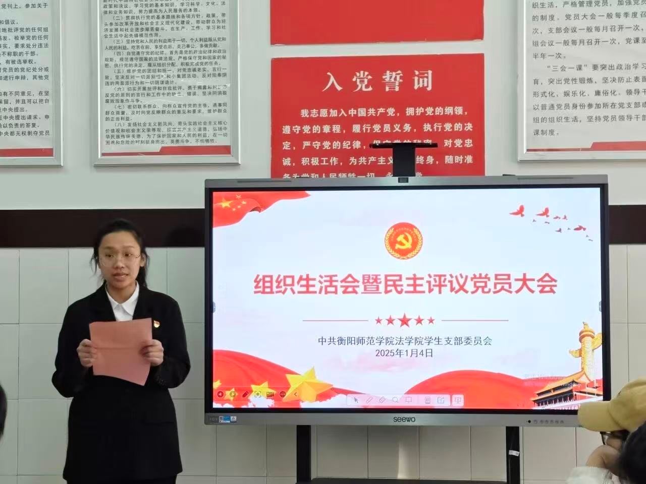为强化党员政治素养与使命担当,提高党员在思想、学习、实践等方面与时代要求的契合度,督促党员与时俱进、提升自我,增强yl8cc永利官网学生党支部在新时代高校育人中的引领力与战斗力。2025年1月4日下午14:00,yl8cc永利官网学生党支部于文科楼B407开展组织生活会暨民主评议党员大会。本次会议由yl8cc永利官网学生党支部书记黎兆萍、全体学生党员(含预备党员)参加,黄慧萍同志担任主持人。