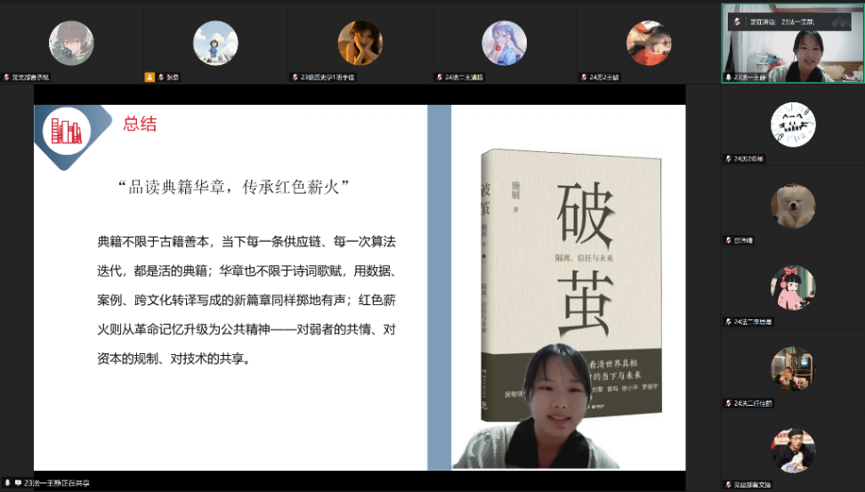 此次线上读书分享会加强了红色文化教育,传承弘扬了红色文化,推动yl8cc永利官网入党积极分子更好地了解当下社会存在的问题,提供思考未来的框架,激发入党积极分子们的思考,引导他们在困境中寻找破茧而出的力量,更好地肩负起当代青年的责任,为新时代中国的建设贡献力量。yl8cc永利官网入党积极分子们也将以此次分享会为契机,在今后的学习和生活中继续深入学习红色文化,传承红色薪火!